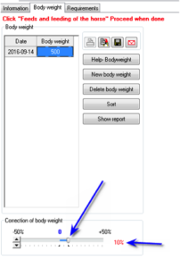 In Pegus P C Horse we can adjust the calculated energy requirement of a horse by choosing “Correction of body weight” when Pegus enter the body weight of the horse (see picture). Pegus can then know how much the calculated energy requirement (in percent) is being changed (red figure). This option is active for all types of horses except for young growing horses. If the body condition of a young growing horse needs to be corrected, it can be done by choosing Normal or High targeted growth rate, or by choosing a higher or lower expected adult body weight, or to change the level of exercise. For a private consultation and feed plan contact your local feed stockist of Pegus and this can be arranged .